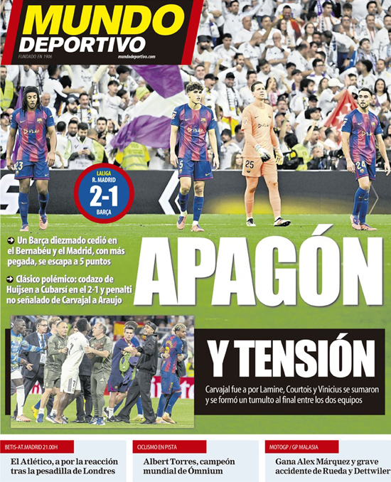 „Vypnutí“ – Katalánské Mundo Deportivo informuje, že oslabená Barcelona kapitulovala na Bernabéu, zatímco Real Madrid s větší palebnou silou odskočil na rozdíl pěti bodů. Kontroverzní El Clásico: Huijsenův loket na Cubarsího za stavu 2:1 a neodpískaná penalta Carvajala na Araúja.