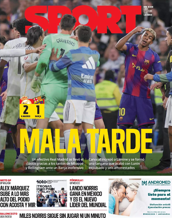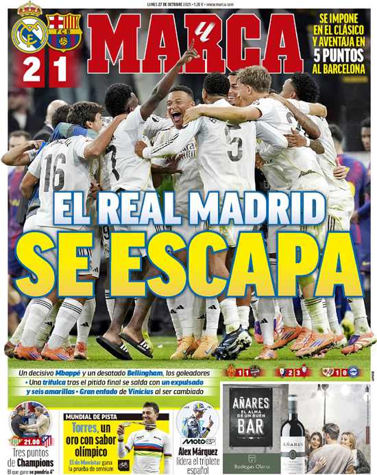 „Real Madrid utíká“ – Deník MARCA informuje, že Bílý balet zvítězil v El Clásicu a má pětibodový náskok před Barcelonou. Rozhodujícími střelci byli Mbappé a rozjetý Bellingham. Po závěrečném hvizdu došlo k potyčkám, které skončily jednou červenou a šesti žlutými kartami. Velké rozhořčení u Viníciuse kvůli jeho stažení ze hřiště.