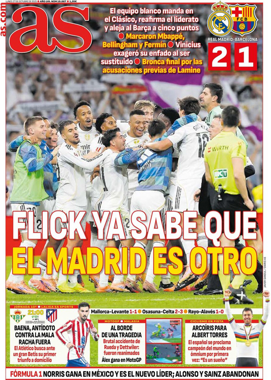 „Flick už ví, že Real je jiný“ – Deník AS píše, že Královský klub ovládl El Clásico, upevnil si vedení v tabulce a odskočil Barceloně o pět bodů. Góly vstřelili Mbappé, Bellingham a Fermín. Vinícius reagoval přehnaně na své střídání. V závěru zápasu došlo ke slovní roztržce kvůli předzápasovým obviněním ze strany Lamineho.
