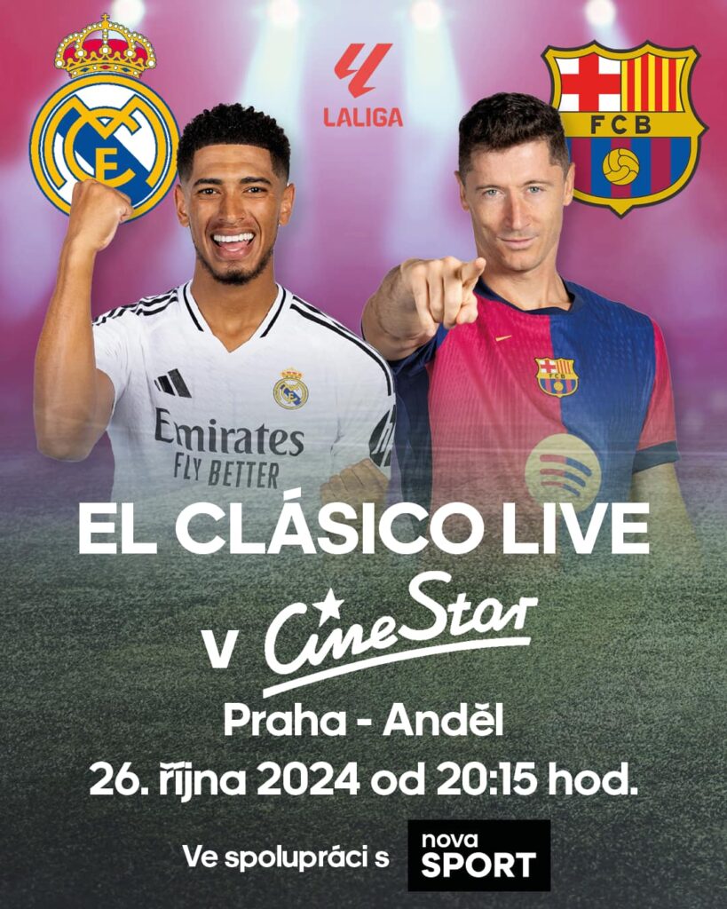 Pokud si chcete vychutnat El Clásico na obřím plátně s prvotřídním zvukem, přijďte v sobotu 26. října do kina CineStar Praha Anděl a užijte si souboj gigantů Real Madrid vs. FC Barcelona jako ještě nikdy předtím. Na co vše se můžete těšit?
