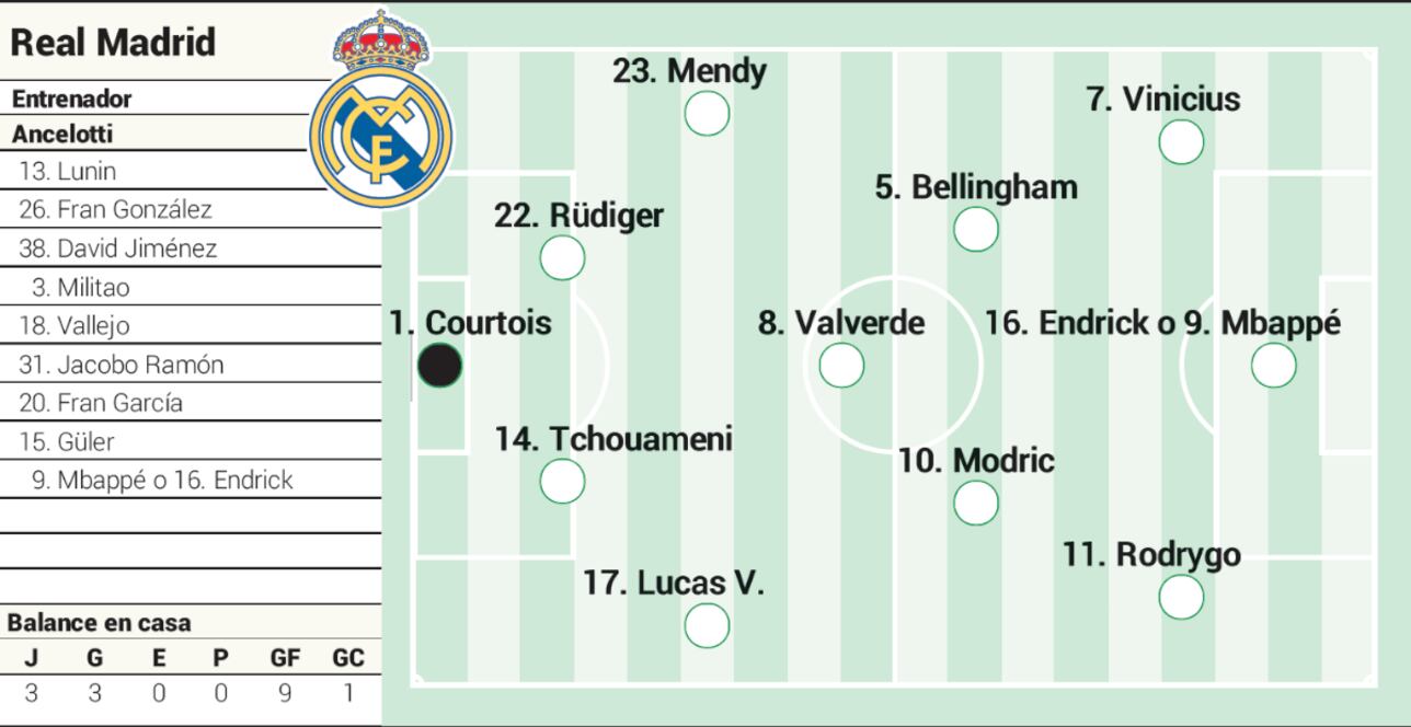 Rodrygo (69. Endrick) – Mbappé (80. Arda) – Vinícius (90. Fran García)