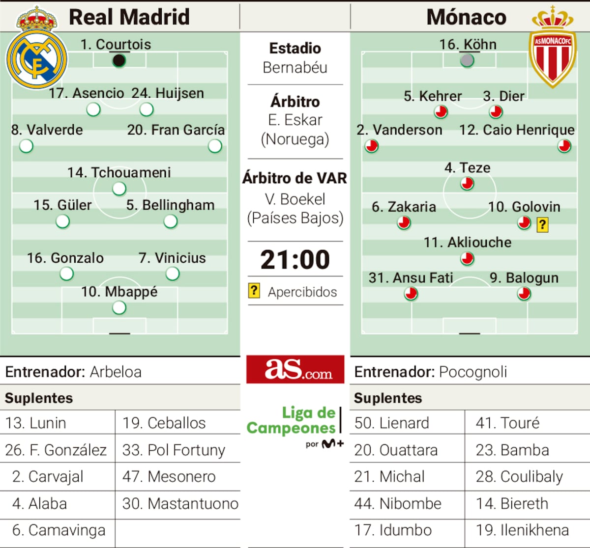 Druhá trefa byla výsledkem ještě pohlednější kombinace. Eduardo Camavinga přenechal míč ve středu pole Ardovi, turecký technik okamžitě vyslal kolmici do běhu na Viníciuse Júniora. Brazilský křídelník pak předložil Mbappému ideální přihrávku před prázdnou branku – 2:0 (26.). Monaco mohlo v úvodním dějství odpovědět, ale nevyužilo dvě obrovské šance: nejprve Ansu Fati zblízka netrefil (19.) a o dvanáct minut později orazítkoval Jordan Teze prudkou ranou břevno (31.).
