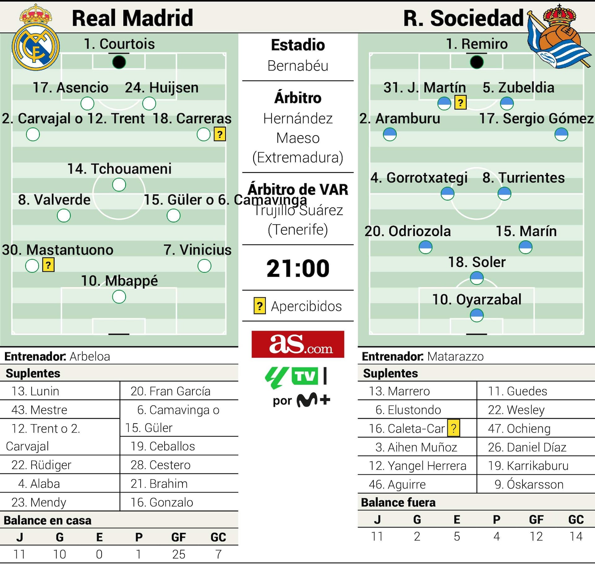 Real Madrid má v lize v tomto kalendářním roce stoprocentní bilanci. Prodloužit ji bude chtít v dnešním utkání 24. kola, v němž bude na Bernabéu hostit od 21:00 baskický Real Sociedad. Duel bude řídit Hernández Maeso. Přímý přenos bude vysílat Nova Sport 4.