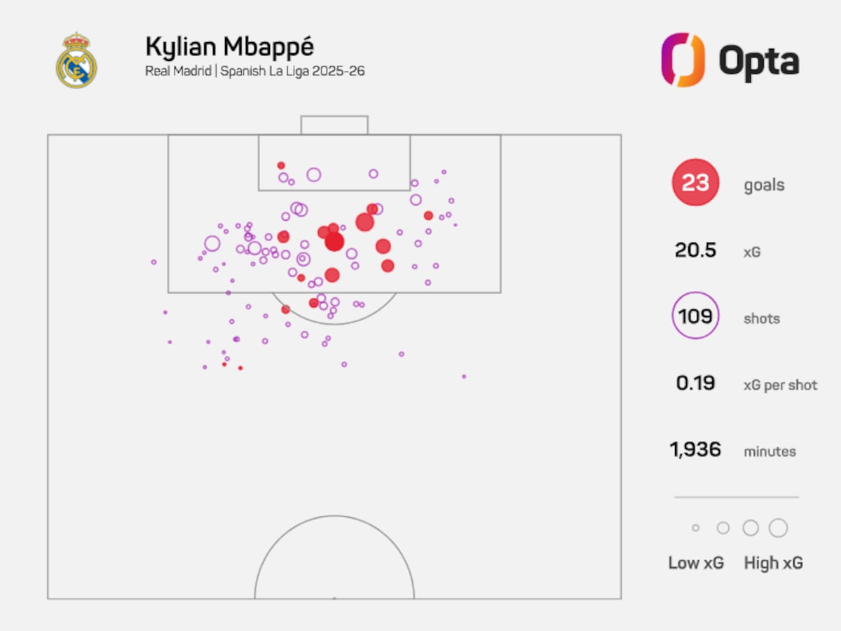 Faktem je, že Mbappého střelecká nenasytnost nemá žádné mantinely. Dokazuje to i skutečnost, že mu chybí už jen sedm branek k překonání svého nejlepšího zápisu v celé kariéře — 44 gólů, na které dosáhl v poslední sezoně v PSG (2023/24) a také ve svém prvním ročníku v Realu. Pokud ho nezastaví zranění, Mbappé má nakročeno k tomu, aby letošní sezonu zakončil s nejlepším osobním střeleckým součtem vůbec.