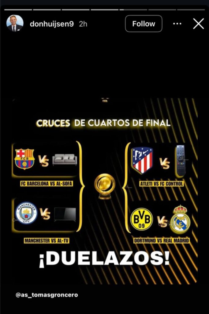 Tomás Roncero, novinář deníku AS (nebo spíš, jak někteří říkají, madridský provokatér), ve čtvrtek zveřejnil na Instagramu obrázek, který šel ještě dál. Uvádí v něm, že ve čtvrtfinále se utkají: Barcelona s Al-Sofa, Manchester City s Al-TV, Atlético Madrid s FC Pilotem a Dortmund s Realem Madrid. Grafikou doplnil nápis: „Velké souboje!“
