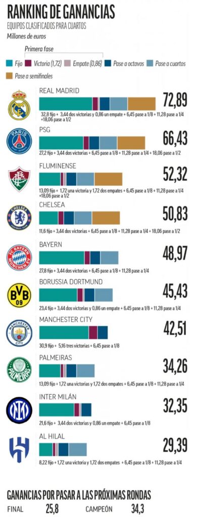 Kromě čtyř semifinalistů, kteří každý vydělali přes 50 milionů, tři týmy překročily hranici 40 milionů (Bayern, Borussia Dortmund a Manchester City), dva přes 30 milionů (Palmeiras a Inter Milán) a saúdský Al-Hilal se přiblížil této hranici s částkou 29,39 milionu eur, uvádí deník MARCA.