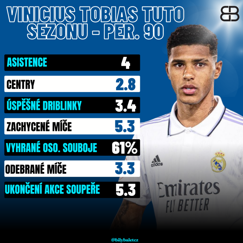 Vinicius Tobias si v letošní sezoně připsal 4 asistence. Zároveň má pak skvělá čísla v průměru na 90. minut herního času. Jak defenzivní, tak i ofenzivní. Je to mladá krev s brazilským stylem hry, tudíž by minimálně z lavičky mohl oživit děj utkání. Po odchozeném střetnutí s Barcelonou jsou právě pohyb a dravost důležité vlastnosti, které madridský klub potřebuje. Myslím si, že se většina shodneme na tom, že by se měl Brazilec dostat v této krizi do prvního týmu, známe ovšem také Carla Ancelotti, který nerad střídá hlavní hráče A-týmu za mladíky z béčka. Je jasné, že při formě hvězd se mladí hráči do sestavy nedostanou, nyní však jsou minimálně dva hráči, kteří mohou při zraněních Tchouaméniho, Alaby a Lucase kádr výrazně oživit.