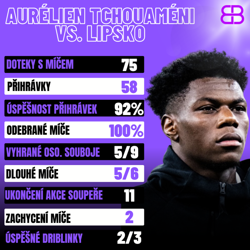 Aurélien Tchouaméni stále nepřestává povolovat ze svého standardu, tedy lépe řečeno nadstandardu. Jeho výkon byl hlavně tedy směrem dozadu opět precizní. V duelu měl 75 doteků s míčem a celkově 58 přihrávek s 92% úspěšností. Zase jsme tak mohli vidět velmi klidnou hru na míči bez větších nepřesností. Jeho čísla v obraných situacích pak byla opět skvělá. Už jen to, že dokázal ukončit akce soupeřů až v 11 případech je velmi nadstandardní počin. Zároveň byl vždy úspěšný u odebírání míče a věřil si také na dlouhé balony, které až 5x našly svého adresáta. V neposlední řadě si pak připsal dva úspěšné driblinky. Sám Carlo měl po zápase jen slova chvály na mladého Francouze, který i podle svých slov bude ještě více růst. Máme se tedy na co těšit!