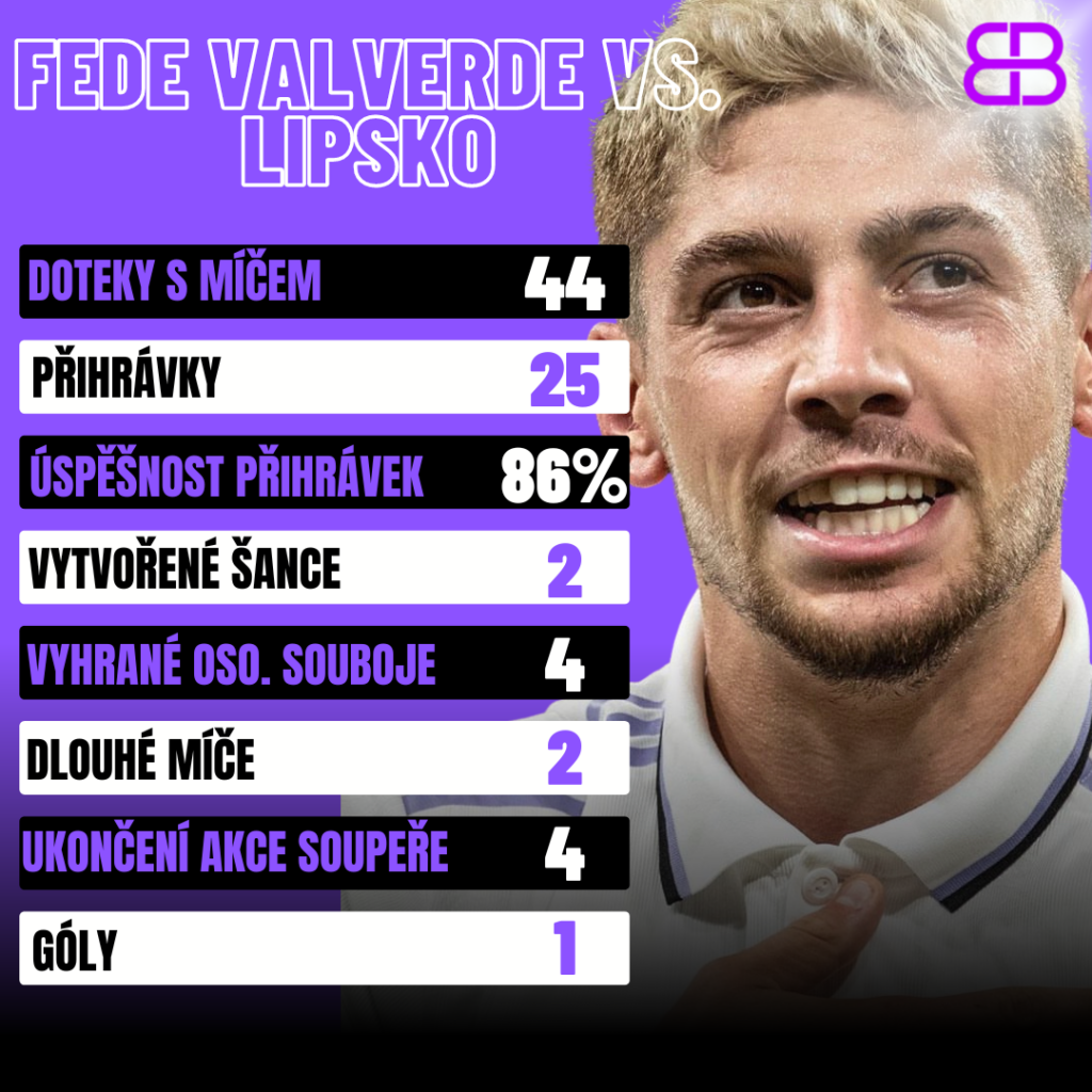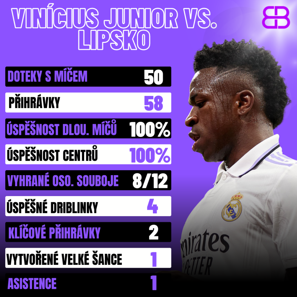 I přesto, že se Vinimu nepodařilo prodloužil svůj gólový streak, odehrál Brazilec opět nadprůměrné utkání. Minimálně tedy druhou půli, kdy si připsal klíčovou asistenci na Valverdeho gól. Možná vám také utkvěl v paměti jeden skvělý centr do vápna soupeře, ze kterého mohl Rüdiger vstřelit gól (kdyby střílel hlavou a ne ramenem :D). No celkově byl v těchto centrech a dlouhých míčích Vini stoprocentní. Zároveň však také vyhrál 8 z 12 osobních soubojů, a úspěšný byl i v driblincích přes obranu. Směrem dopředu to tak bylo opět naše největší nebezpečí.